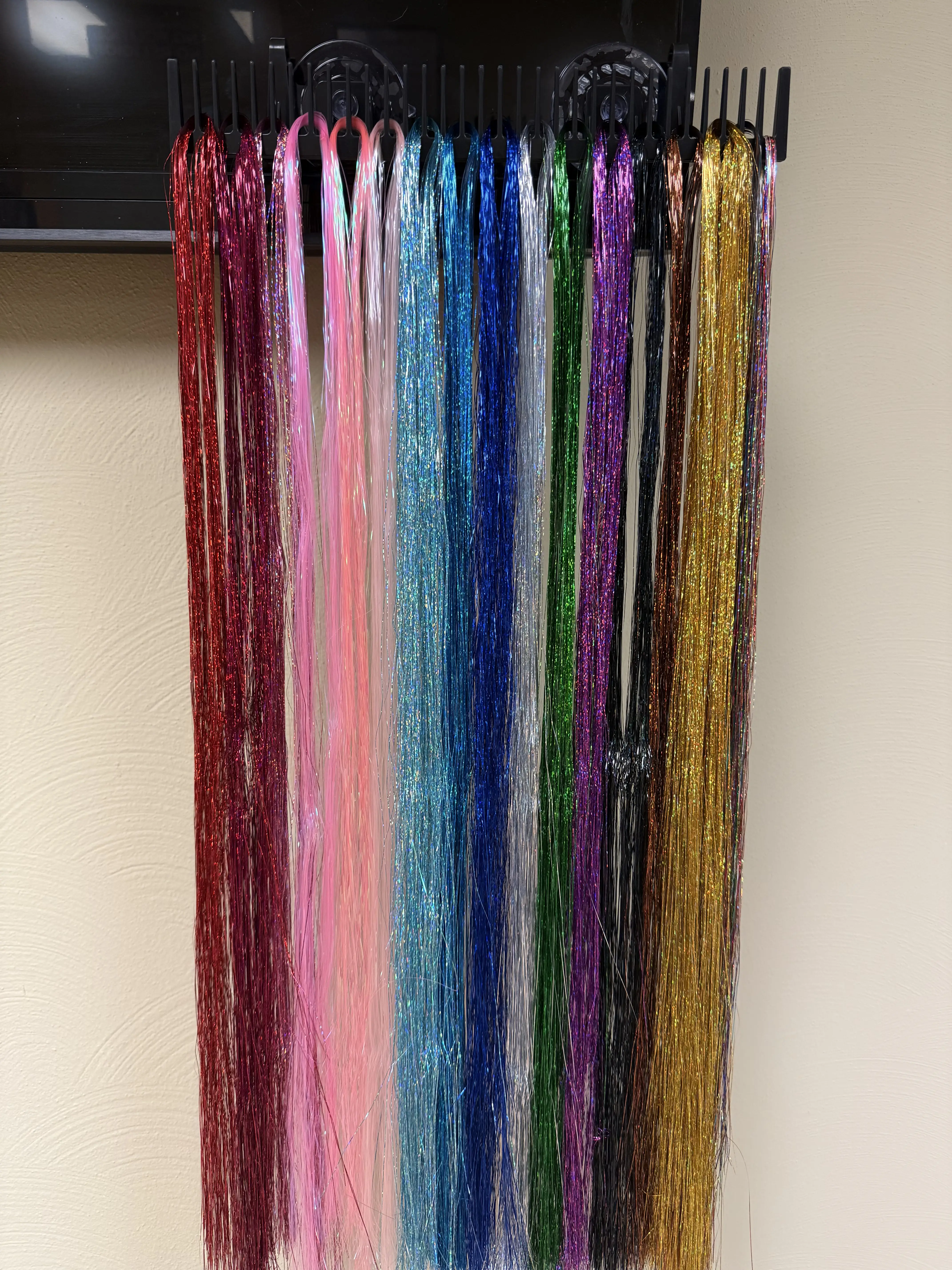 Tinsel is tied to a bead that is silicone on the inside and metal on the outside. Bead is installed in the hair and can easily be removed with pliers. 4beads for $10.